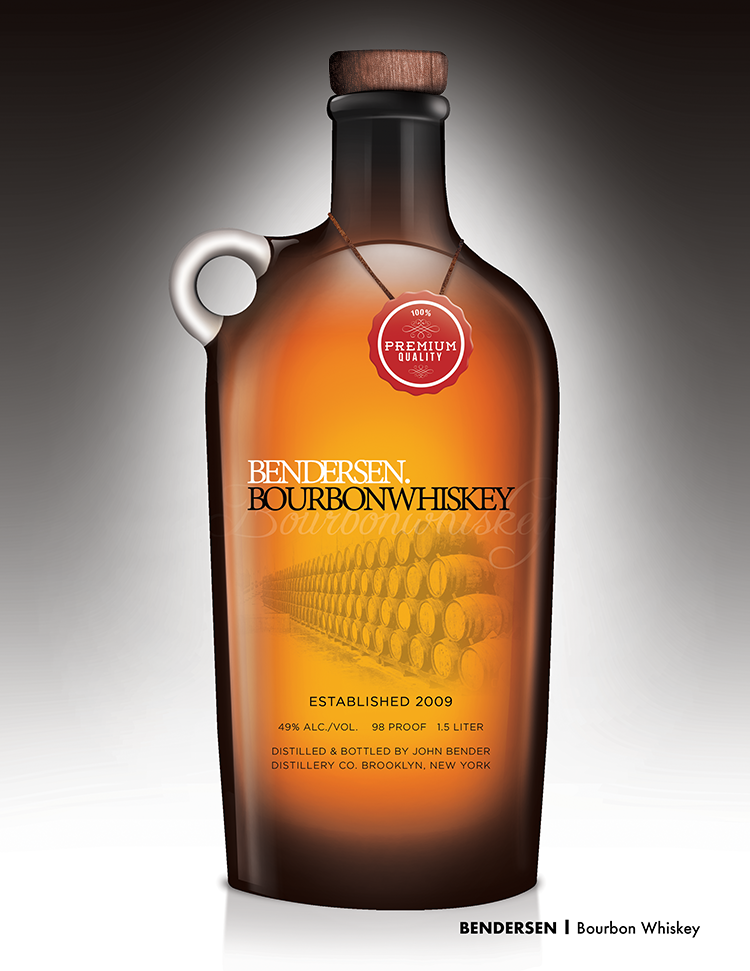 Conceptual design for a whisky bottle and label, featuring the brand's name prominently in the title and designing the bottle to appeal to a broad audience of whisky enthusiasts.