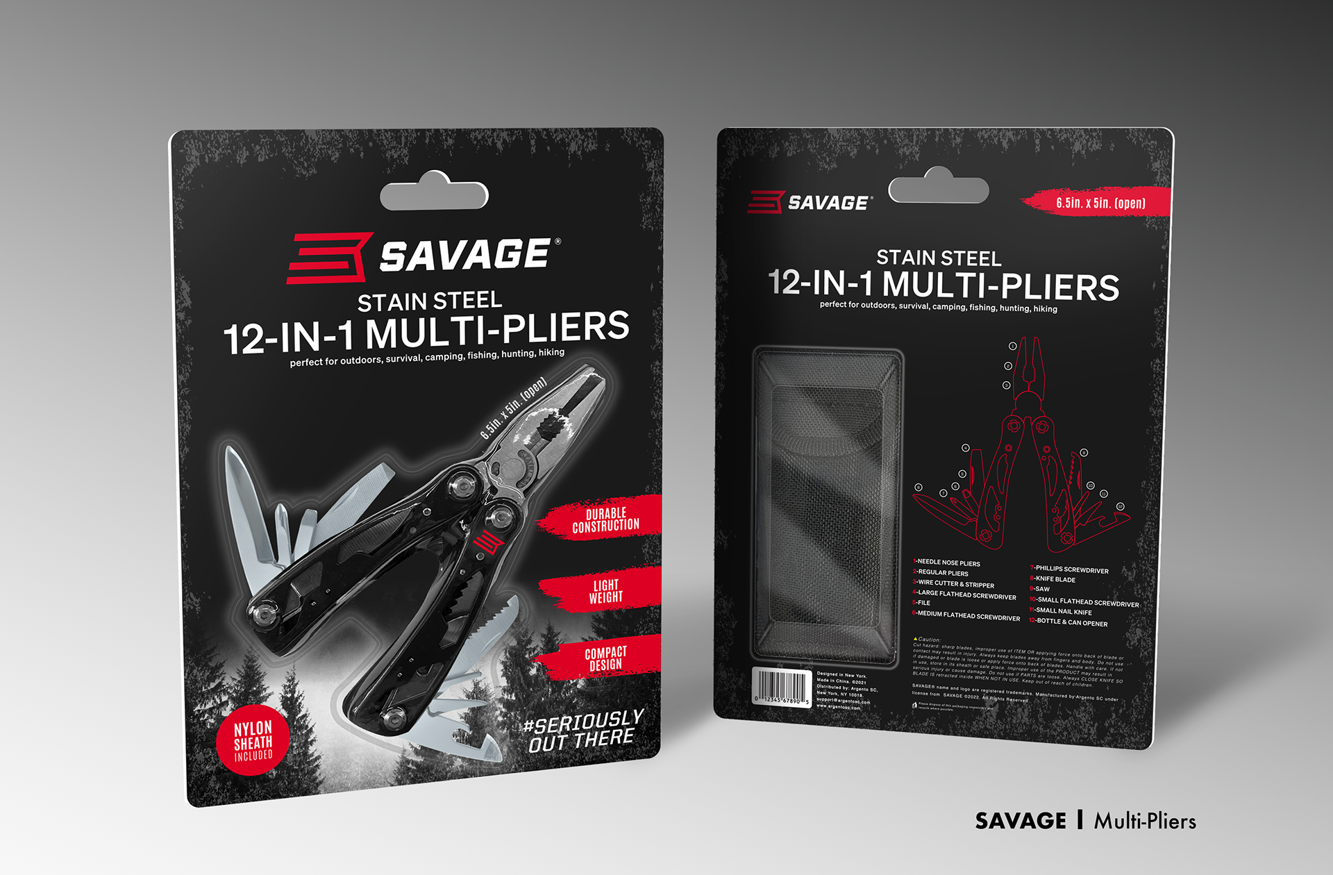 Tasked with designing the packaging for the Savage multi-plier, integrated the existing style guide while incorporating a more outdoor-oriented aesthetic to enhance its appeal.